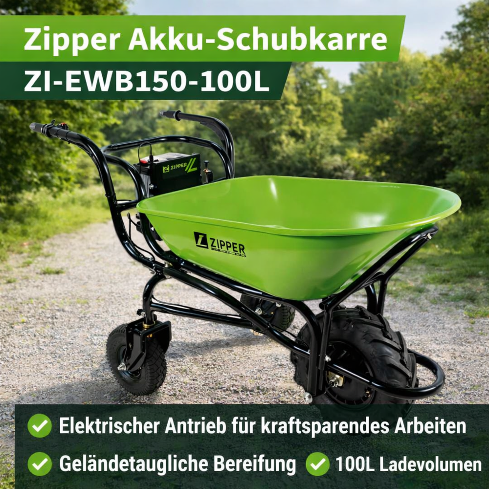 Die elektrische Schubkarre von ZIPPER ZI-EWB150-100l ist ideal für den Transport von Schüttgütern rund um Haus, Hof und Garten. Die ZI-EWB150-100l ist Teil der ONE-FOR-ALL Serie und somit ist der Akku für eine Reihe von weiteren ZIPPER-Geräten kompatibel. (Kettensäge/Rasentrimmer/Rasenmäher/Laubbläser,....)