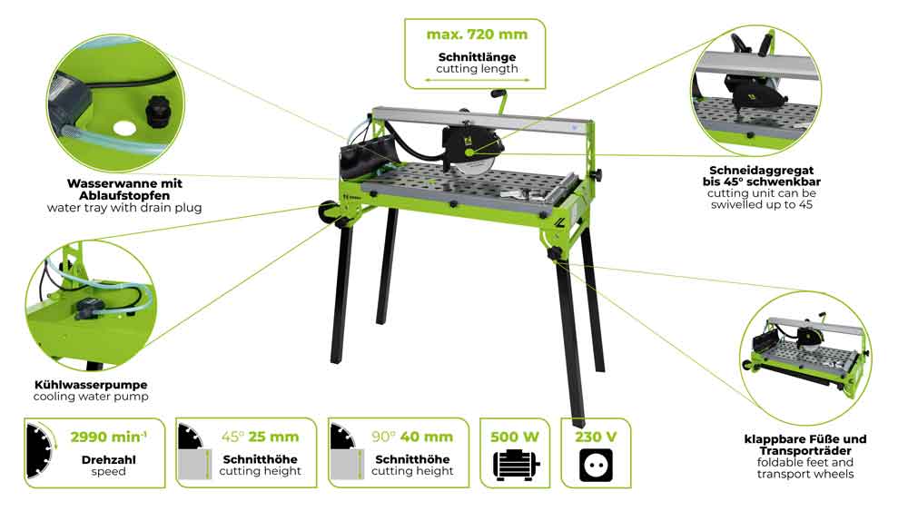 Die ZIPPER Fliesenschneidmaschine ZI-FS200-720 mit Ø200 mm Diamantscheibe, Transporträdern, Kühlwasserpumpe und Schiebeschlitten für glatte und saubere Schnitte auf Ihrer Baustelle.