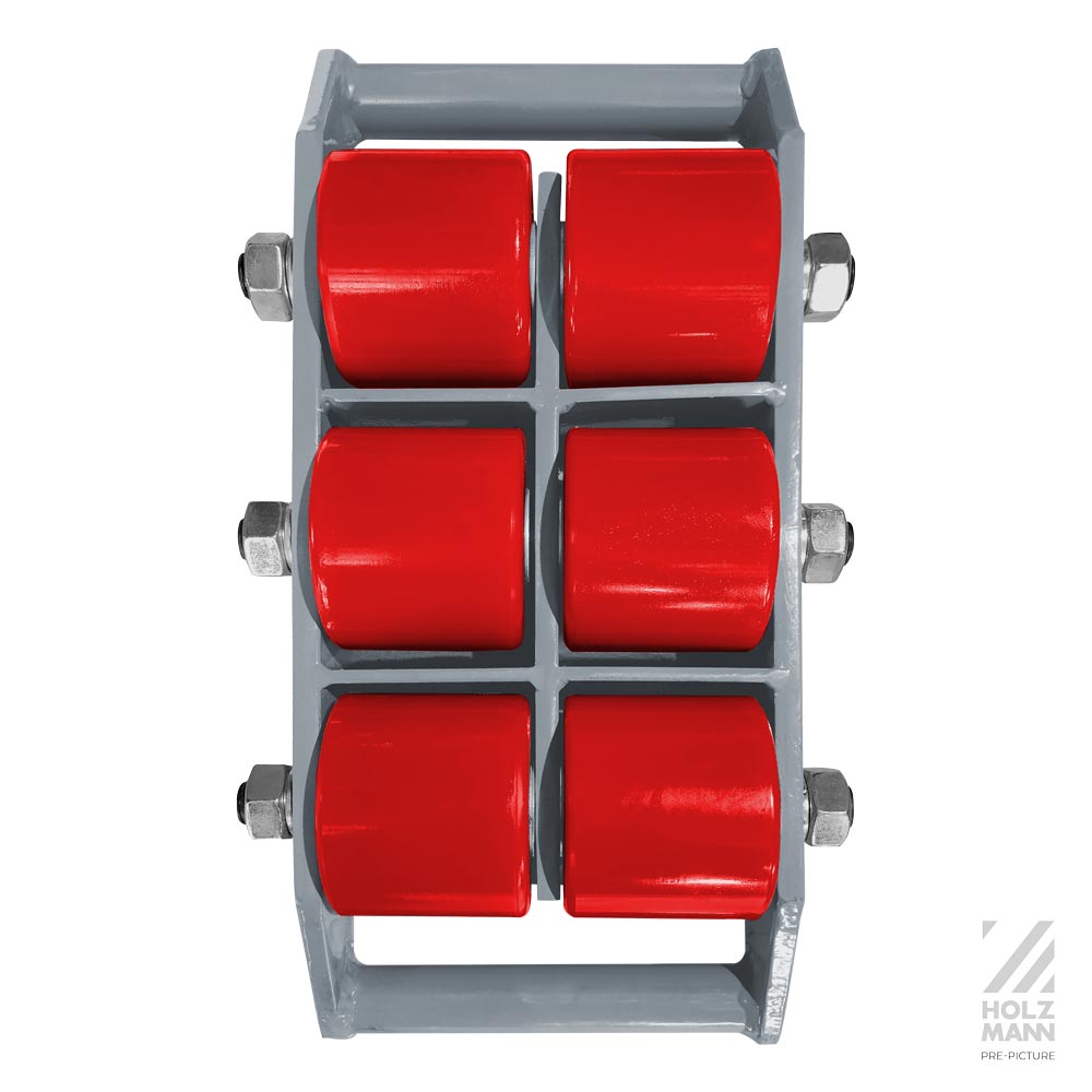 Die HOLZMANN Panzerrollen PR8T mit max 8 t Beladung zur Beförderung von schweren Gütern auf ebenem und festem Untergrund. Ausgestattet mit 6 PU-Rollen (Ø80 x 70 mm), Drehteller von Ø150 mm.