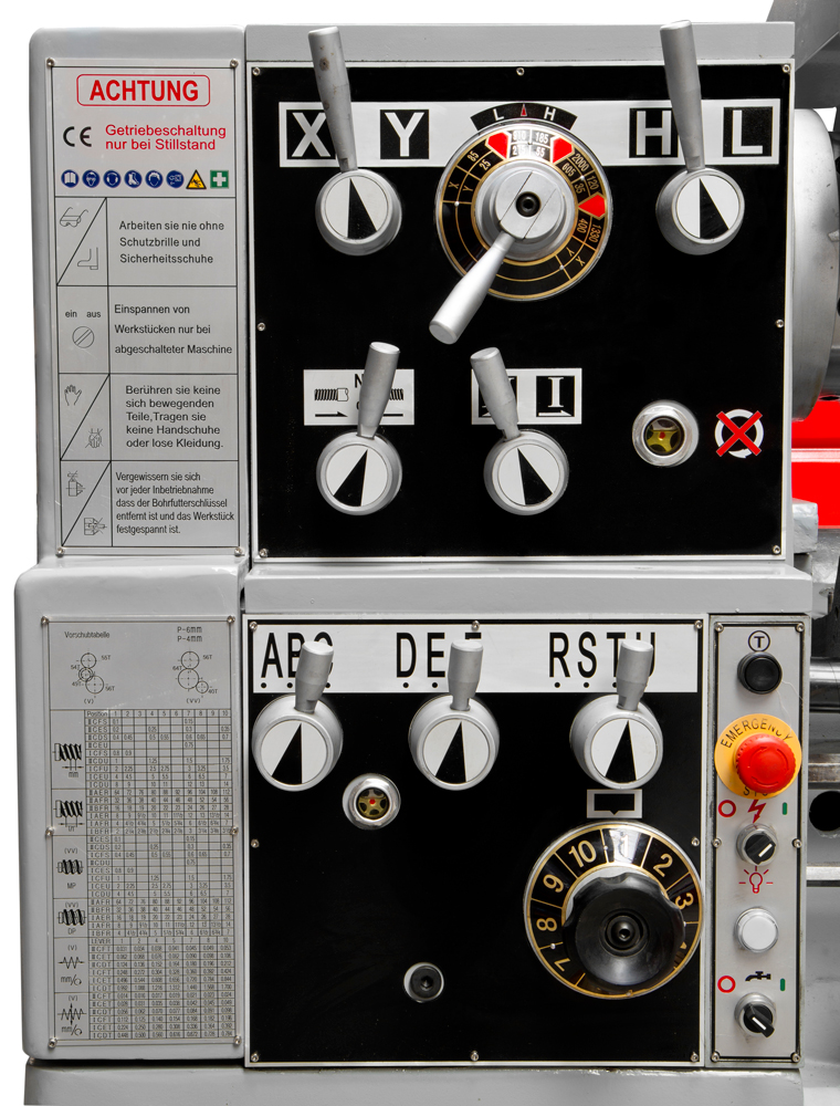Lieferumfang: 3-Achs Digitalanzeige, Kühlmitteleinrichtung, Halogenlampe, 3-Backenfutter Ø250mm, 4-Backenplanscheibe 250mm, Aufspannscheibe 350mm, Reduzierhülse, Gewindeuhr, Wechselräder, feste und mitlaufende Lünette, Vierfachstahlhalter, Zentrierspitzen, Spritzschutz, 2xKörnerspitze MK3