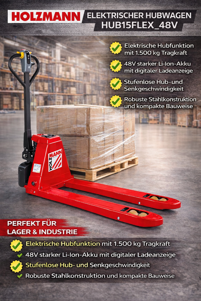 Produktinformationen "Holzmann voll elektr. Hubwagen HUB15FLEX_48V - Sonderaktion"